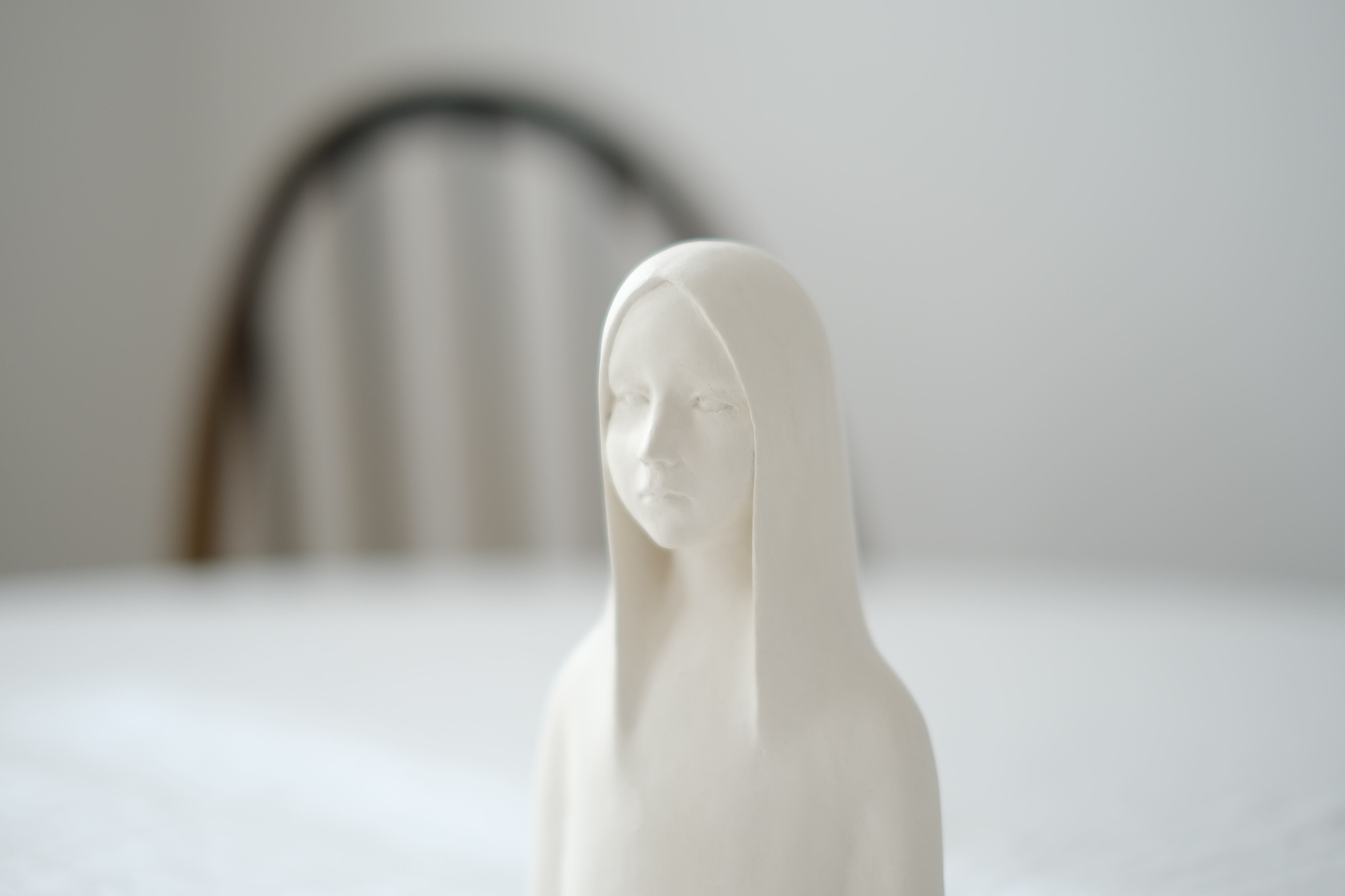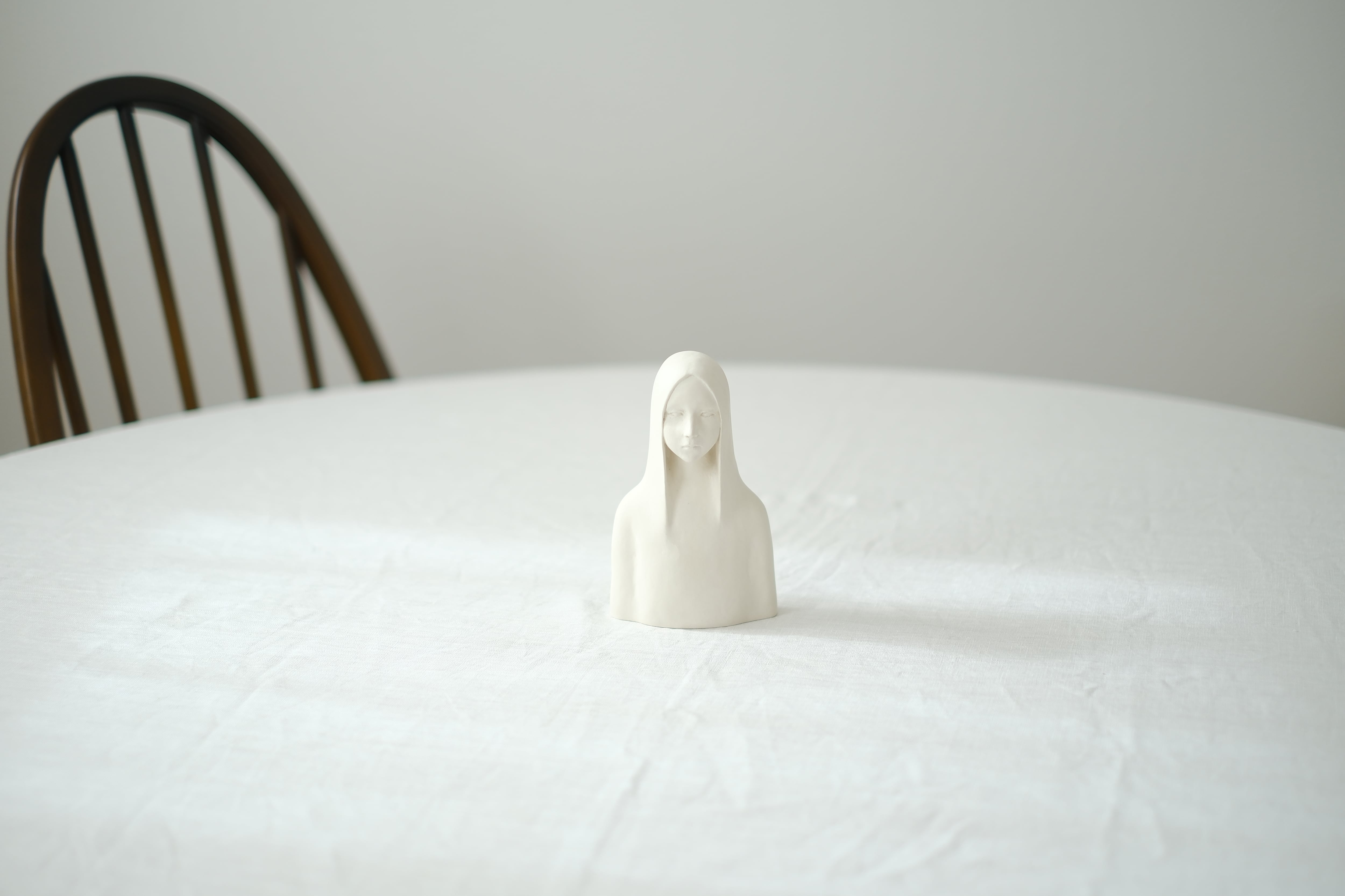 様々な白の石と色粉を使って、光と影を表現した作品。胡粉の白、水晶の白、また柔らかな土の黄を含んだ白を重ねることで温度を感じる白の人物です。