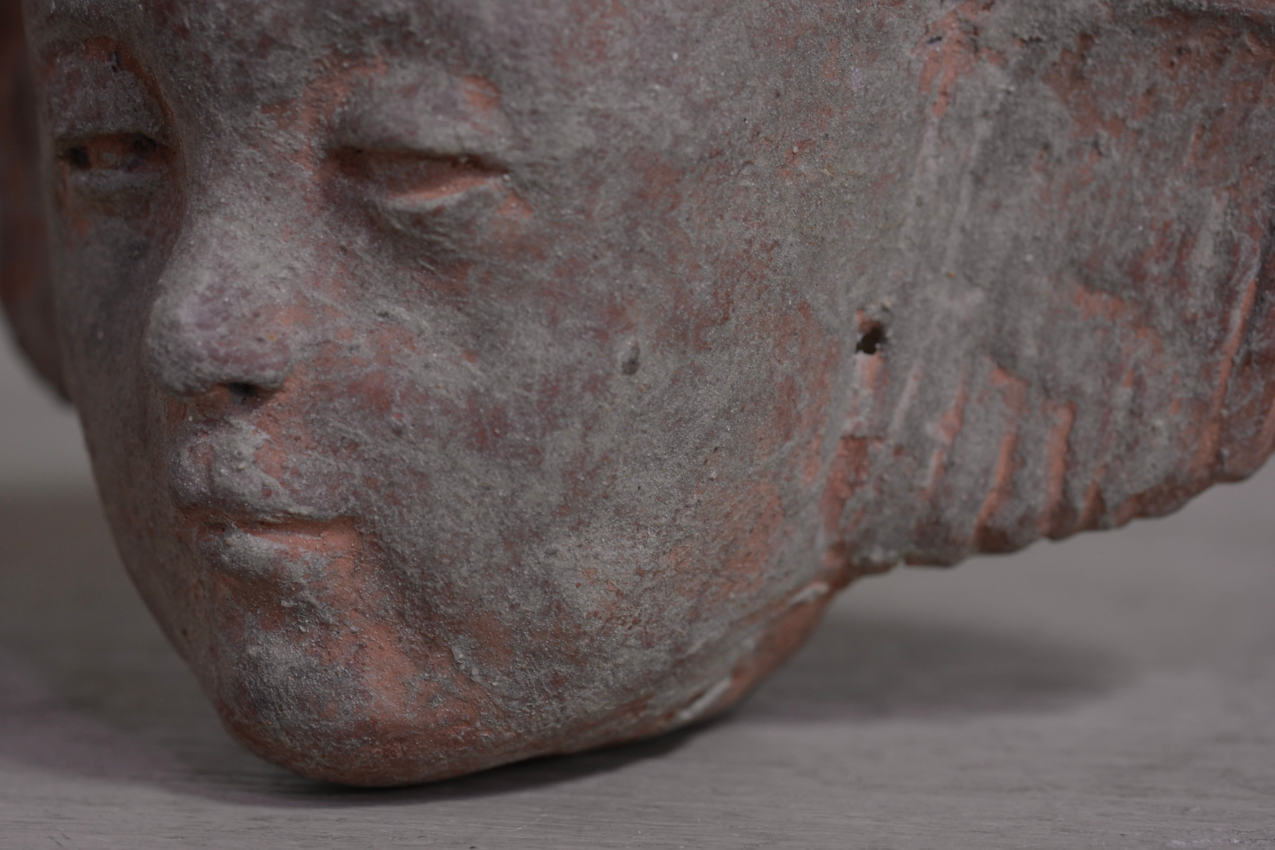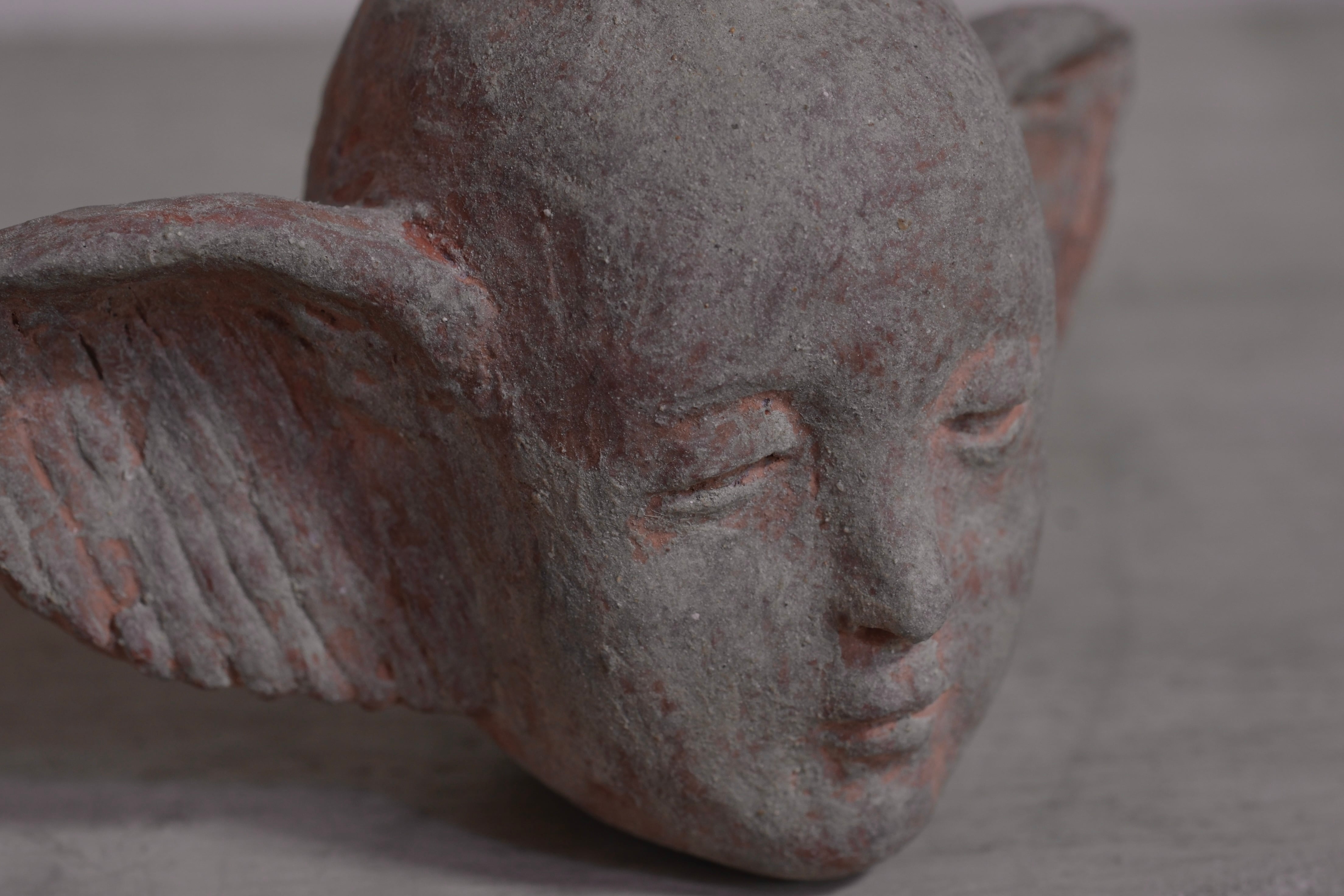 The surface, which appears like red clay, is topped with a layer dusted with soil-like colors, giving it the look of an ancient, time-worn artifact. Additionally, a very few, tiny points of quartz powder are applied, creating sparkling spots.